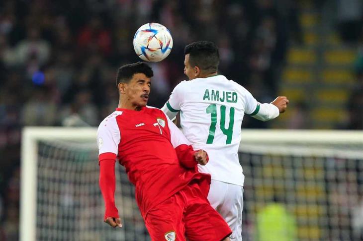 توقف اللعب في الدقيقة 90+2 بعد سقوط لاعب منتخب عمان ممُسكا بقدمه قبل أن تُتسأنف المباراة.