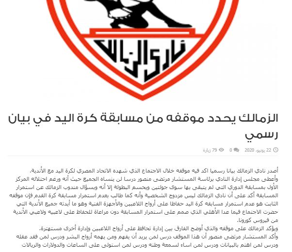 وجاء بيان الزمالك عقب اجتماع اتحاد الكرة اليد المصري مع الأندية لمناقشة مستقبل مسابقة الدوري، حيث رفض جميع مندوبي الأندية عودة النشاط باستثناء الأهلي وصيف المسابقة حاليًا.