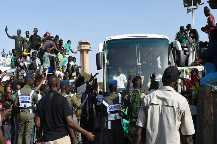 واحتشدت أعداد غفيرة من المشجعين لاستقبال بعثة المنتخب السنغالي التي استقلت حافة من مطار ليوبولد سيدار سينجور الدولي إلى المقر الرئاسي.
