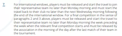 وتقول لائحة "فيفا" وتحديداً في البند رقم 7 في لائحة انضمام اللاعبين إلى المنتخبات الوطنية الآتي: "بالنسبة للمباريات الدولية، يجب على اللاعبين التصريح لهم بالسفر للانضمام إلى فرقهم التمثيلية في موعد أقصاه صباح الاثنين، والعودة إلى أنديتهم في موعد أقصاه صباح الأربعاء التالي لنهاية فترة المباريات الدولية. أما بالنسبة للمنافسة النهائية وفقًا للفقرتين 2 و3 أعلاه، فيجب على اللاعبين التصريح لهم بالسفر إلى فرقهم التمثيلية في موعد أقصاه صباح الاثنين من الأسبوع الذي يسبق بداية البطولة النهائية، ويجب على الاتحاد التصريح لهم بالسفر صباح اليوم التالي لآخر مباراة لفريقهم في البطولة".