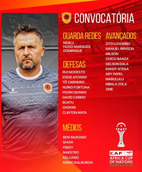 أعلن الاتحاد الأنجولي لكرة القدم، قائمة المنتخب الأول، التي اختارها المدير الفني الفرنسي باتريس بوميل، للمشاركة في بطولة كأس الأمم الأفريقية 2025 بالمغرب.