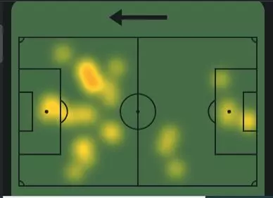 تمركزاته كما تُظهر الخريطة الحرارية، كانت بالقرب أو داخل منطقة الجزاء دائمًا، بحكم مركزه كمهاجم، وليكون في حالة استعداد للتسديد في أي وقت.