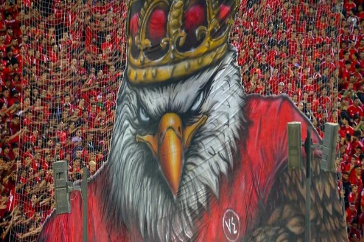 ورفعت جماهير الأهلي في إياب نهائي دوري أبطال أفريقيا، تيفو خاص، ظهر خلاله النسر الأحمر على رأسه تاج من ذهب، مع رسالة، كتب فيها: "إذا حضر ملك اللعبة.. ينتهي دور المزيف".