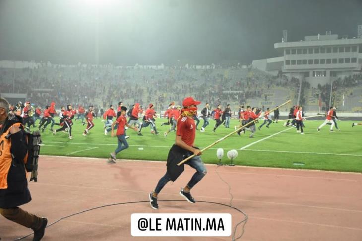 ونشرت صحيف"لو ماتين" المغربية، صورا لجماهير الوداد المغربي التي اقتحمت أرض الملعب عقب صافرة النهاية، حاملين العصي متجهين لمدرجات جماهير الرجاء.