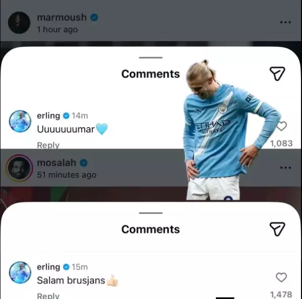 ولم يكتفِ بذلك، حيث دعم هالاند زميله مرموش في مانشستر سيتي أيضًا بطريقة طريفة، حيث علق على منشوره قائلًا: "عمرررررر 💙".