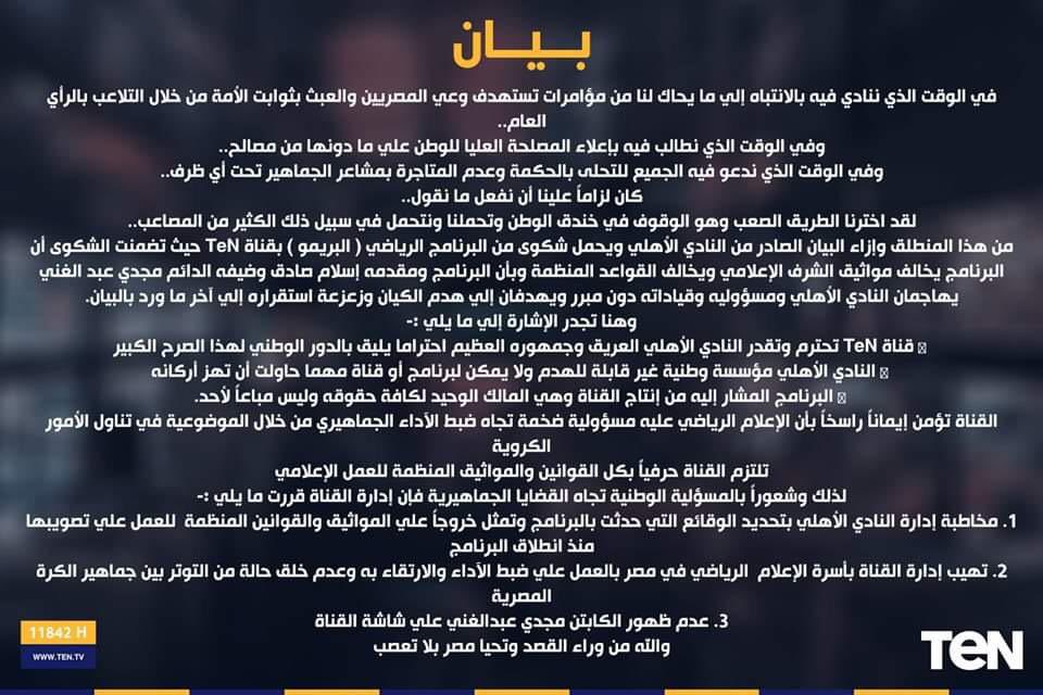 ونشر الحساب الرسمي للقناة عبر تويتر، بيانًا أكد فيه أن الإدارة تلقت شكوى من جانب النادي الأهلي من خلال بيان رسمي من القلعة الحمراء ضد برنامج البريمو بسبب الضيف الدائم مجدي عبد الغني دائم الهجوم على النادي الأهلي ومسؤوليه دون مبرر حيث يهدف إلى هدم الكيان وزعزعة الاستقرار.