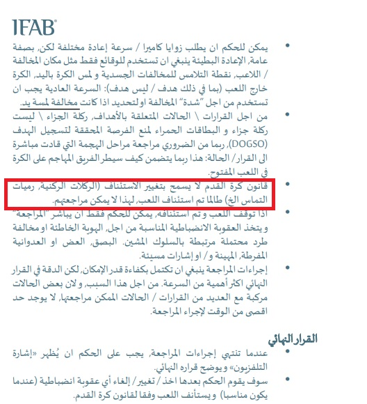 ولكن هنا نصر بروتوكول الفار يتحدث صراحة عن قانونية بتغيير الاستئناف ( للركلات الركنية, ورميات التماس .. إلخ) طالما تم استئناف اللعب وقال أنه لا يمكن مراجعتها .