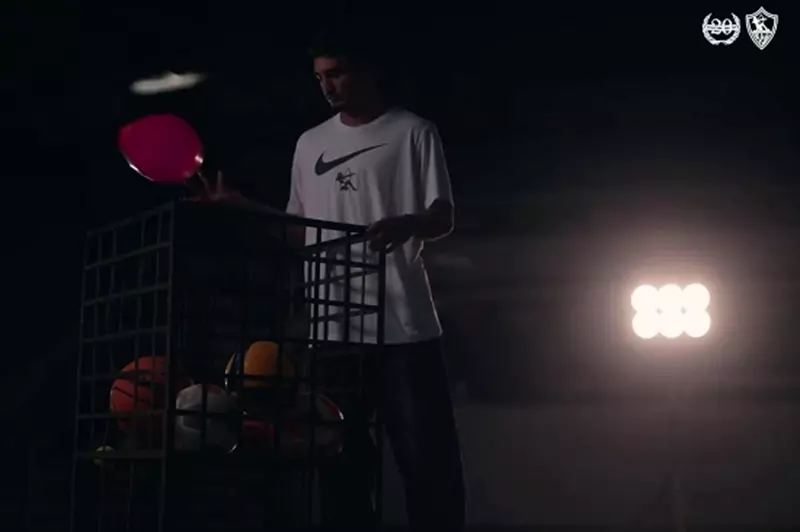 ظهر أحمد شريف لاعب الزمالك وهو يسير تحت أضواء خافتة متجهًا إلى سلة تحمل العديد من الكرات، لتلتقط يده "بالونة" حمراء اللون ليقوم بإبعادها في اتجاه معاكس.
