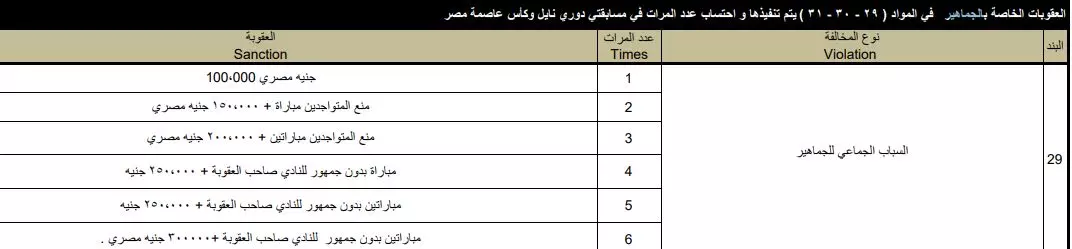 وتنص اللائحة على أنه حال تكرار السباب الجماعي من جانب الجماهير، 4 مرات خلال الموسم، يتم توقيع عقوبة على النادي، بخوض مباراة وحيدة بدون جمهور، بالإضافة إلى غرامة تصل إلى ربع مليون جنيه.