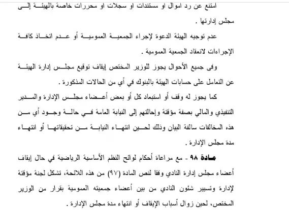 المادة رقم 98 المعدلة أيضًا في قانون الرياضة تمنح الحق للوزير في تعيين لجنة مؤقتة من أعضاء الجمعية العمومية أو من ذوي الخبرة بقرار وزاري حتى زوال السبب أو انتهاء مدة المجلس.