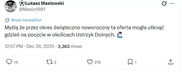 وقال لوكاس ماسلوفسكي بالرد على ما نشره آدم زمودزينسكي، قائلًا: "أعتقد أنّه بسبب فترة الأعياد ورأس السنة، ربما يكون هذا العرض قد عَلِق في مكتب بريد قريب من مقر نادينا".