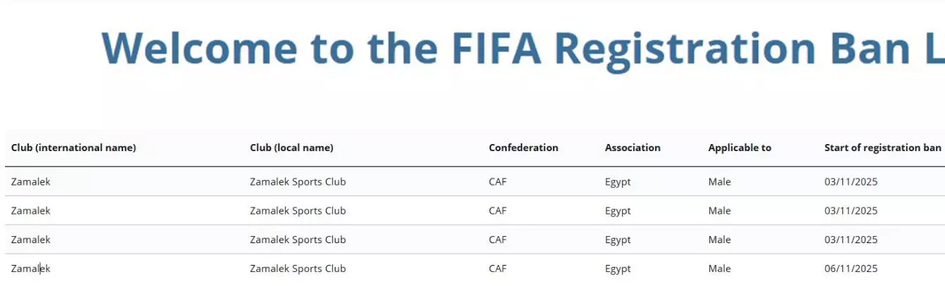 وكشفت بوابة العقوبات الخاصة بالاتحاد الدولي لكرة القدم "فيفا"، عن إيقاف قيد جديد لنادي الزمالك، بتاريخ اليوم 6 نوفمبر 2025.