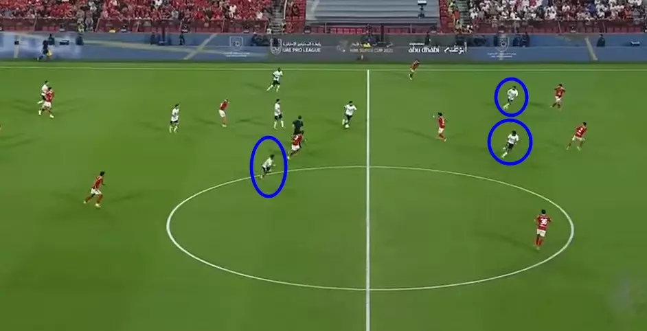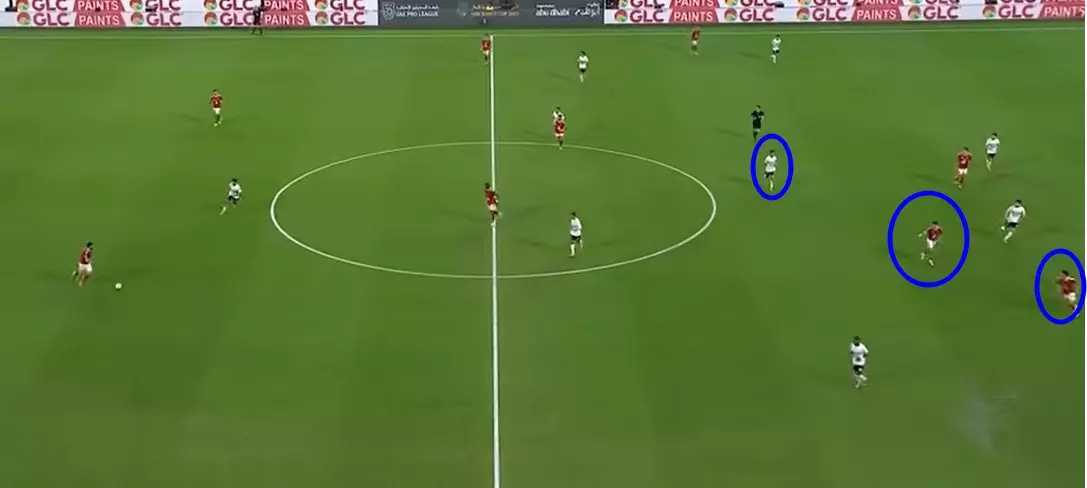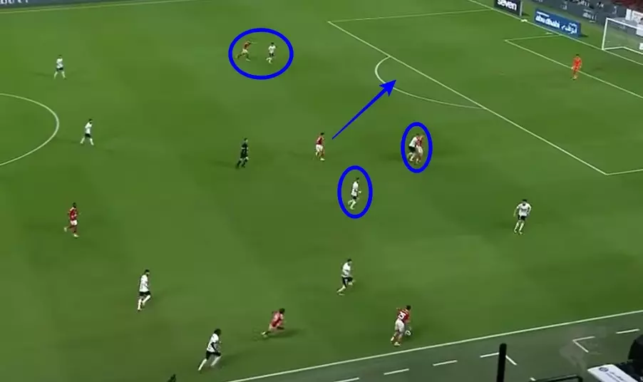 وفي الوقت ذاته وجد الونش نفسه تائهًا في كرة الهدف الأول للنادي الأهلي، حيث تأخر في اتخاذ قراره بالعودة لمراقبة جراديشار، ليضع محمد إسماعيل في مأزق حيث كان ملزمًا بإيقاف ثنائي هجوم الأحمر.