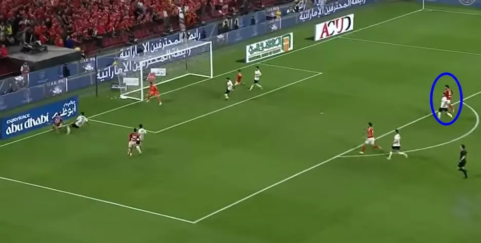 استمرت تلك الهجمة عقب تمريرة من مروان عطية نحو طاهر محمد طاهر، ليكمل لاعب الوسط انطلاقته لمتابعة عرضية مهاجم الفريق الأحمر، وسط تأخر عبد الله السعيد في عملية الرقابة والالتحام مع منافسه، مما منح الأفضلية لنجم الأهلي.