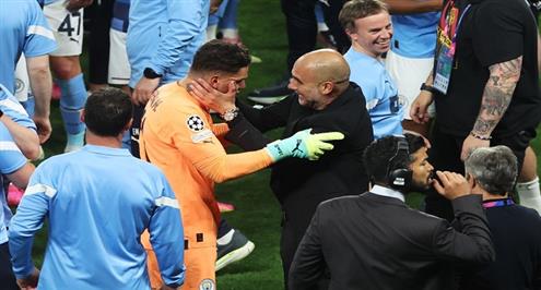 أحضان وبكاء من جوارديولا ولاعبي مانشستر سيتي بعد الفوز بدوري أبطال أوروبا