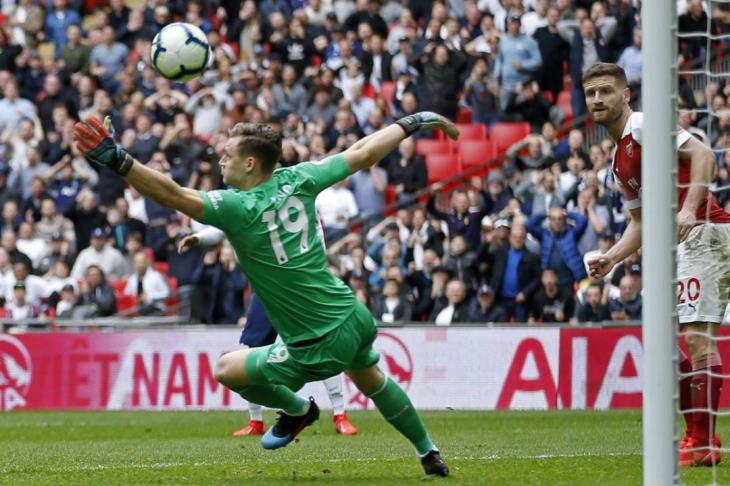 تصدى بيرند لينو حارس مرمى نادي أرسنال الإنجليزي، لفرصة مزدوجة من لاعبي توتنهام هوتسبر برد فعل رائع.