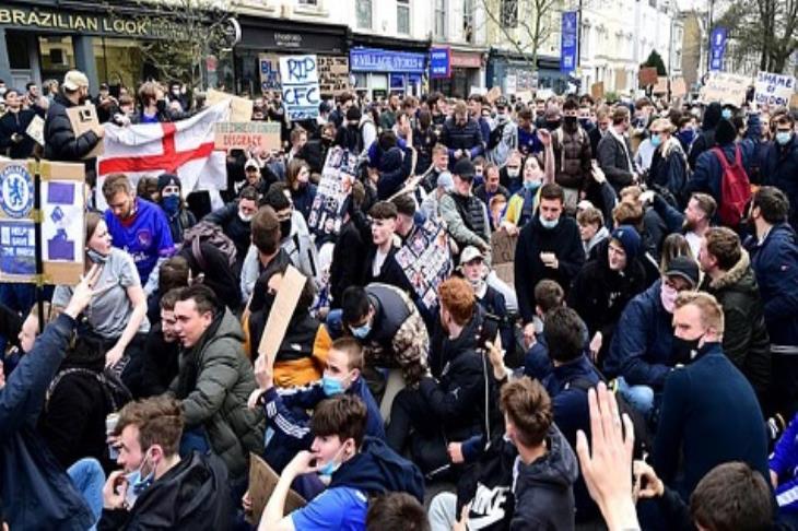 احتشد عدد كبير من جماهير نادي تشيلسي أمام ملعب ستامفورد بريدج قبل دقائق من مباراة الفريق ضد برايتون في الدوري الإنجليزي الممتاز "بريميرليج"، احتجاجًا على قرار الإدارة بالمشاركة في دوري السوبر الأوروبي.
