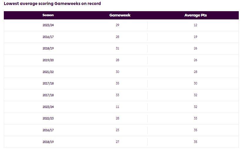وشهدت الجولة 29 للموسم الحالي (2023-2024)، متوسط 12 نقطة فقط في لعبة "فانتازي"، وهو الأسوأ في تاريخ اللعبة.