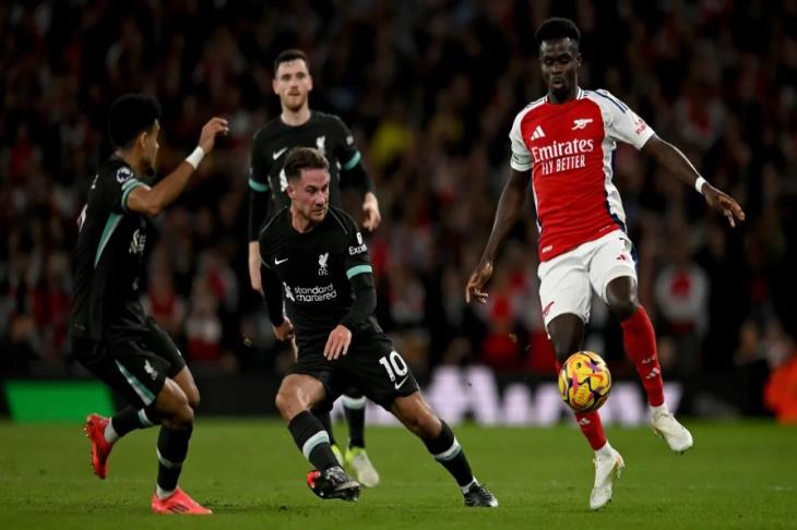 يشعر بوكايو ساكا، لاعب أرسنال، بخيبة أمل بعد التعادل مع ليفربول في بطولة الدوري الإنجليزي.