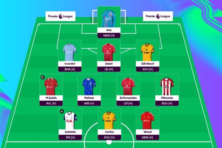 - الوسط: صلاح من ليفربول (28 نقطة بسبب شارة الكابتن)، بالمر من تشيلسي (نقطتان)، برونو فرنانديز من مانشستر يونايتد (17 نقطة)، مبيومو من برينتفورد (5 نقاط)