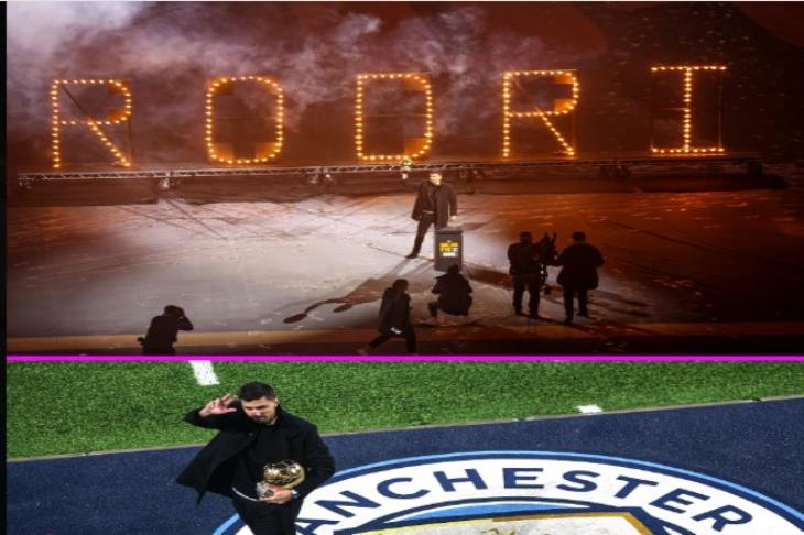 وظهر رودري في ملعب الاتحاد وهو يحمل الكرة الذهبية وذلك في مشهد تكريمي له أمام عشاق مانشستر سيتي.
