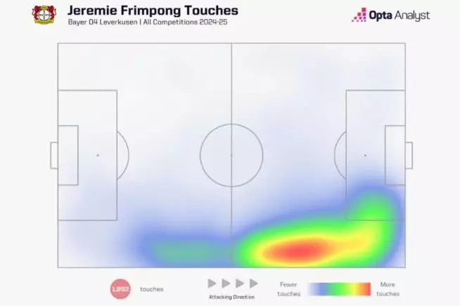 فقط فيرتز (162) وباتريك شيك (118) كان لديهما عدد لمسات أكثر في منطقة جزاء المنافس من فريمبونج (117) مع ليفركوزن في الدوري الألماني في 2024/25، في حين أن معدل لمساته البالغ 4.5 لمسات في منطقة جزاء المنافس لكل 90 دقيقة هو أكثر بكثير من 1.9 لمسات لألكسندر أرنولد.