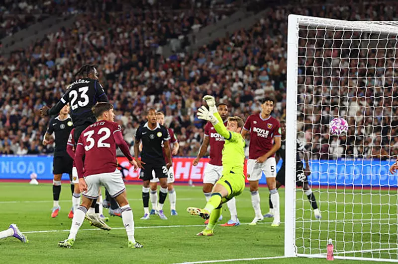 رأسية قوية من توماس سوسيك لكن حارس تشيلسي تصدى لها وخرجت بعد ذلك إلى ركنية، لتضيع فرصة هدف على وست هام