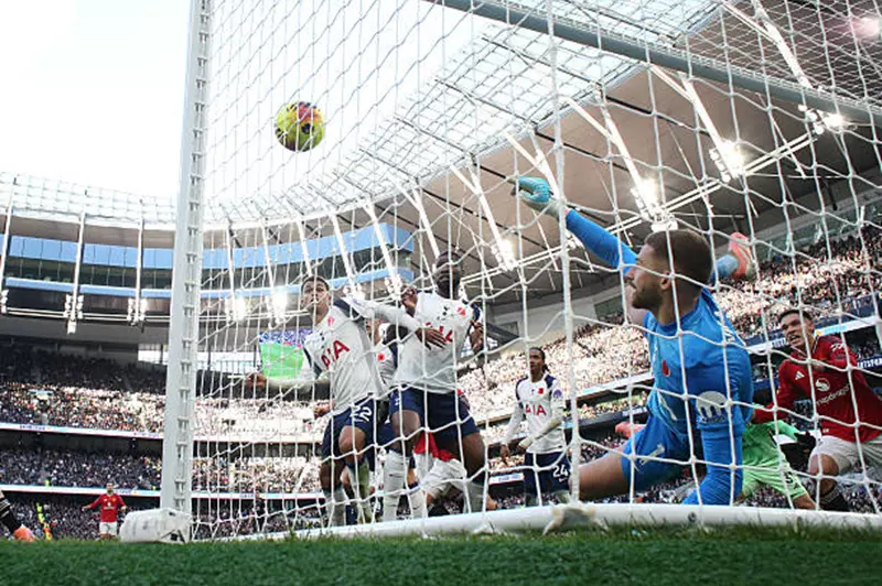 برونو فيرنانديز يسدد الضربة الثابتة باتجاه المرمى ولم يتابعها أحد من الهجوم بصورة جيدة ووصلت في يد حارس توتنهام بعد ذلك