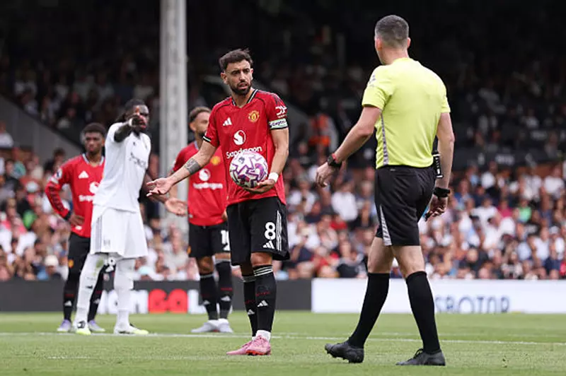 بدا اللاعب البرتغالي برونو فيرنانديز غاضبًا من الحكم كريس كافاناج بعد أن اصطدم به قبل تنفيذ ركلة جزاء لمانشستر يونايتد أمام فولهام.