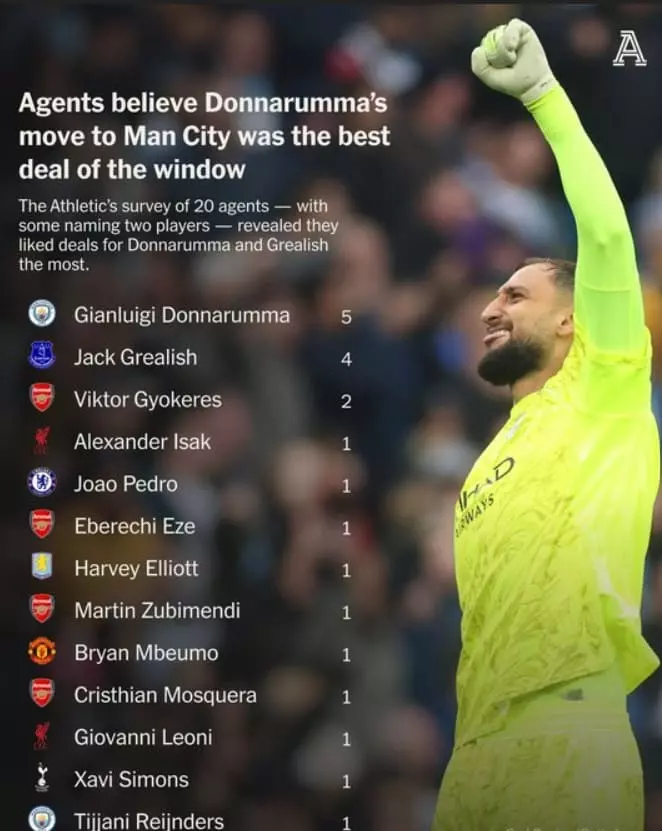 وكشفت أنه بعد سؤال 20 وكيل لاعبين، تم اختيار جيانلويجي دوناروما، الحارس الوافد لصفوف مانشستر سيتي من باريس سان جيرمان، كأفضل صفقة في الميركاتو الصيفي المنقضي.