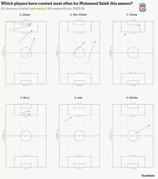 ووفقًا للشبكة ذاتها، فإن الفرص المصنوعة لصلاح أصبحت أقل بكثير، ويعد كودي جاكبو هو أكثر اللاعبين الذين صنعوا فرصًا للنجم المصري هذا الموسم.