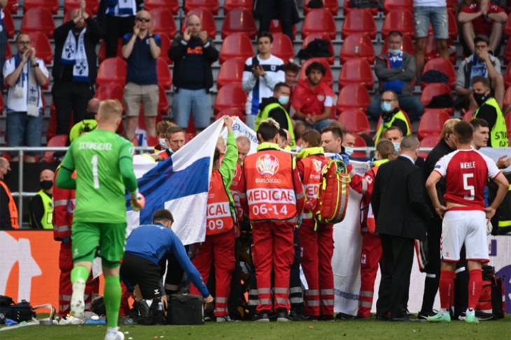 وشهد ملعب "باركن ستاديون" في كوبنهاجن حالة بالغة من القلق بعد سقوط إريكسن مغشيًا عليه، حيث انهار نجم إنتر ميلان الإيطالي داخل الملعب دون أي تدخل من أي لاعب آخر قبل دقيقتين من نهاية الشوط الأول.