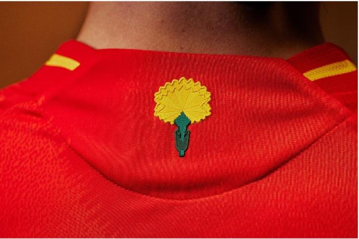 وتظهر زهرة القرنفل على قمصان منتخب إسبانيا على الجزء الخلفي من الرقبة، والتي تهدف إلى توحيد المشجعين واللاعبين من خلال رمز يجمع بين التميز والحب.