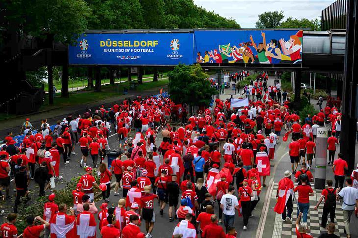 رفع أحد جماهير المنتخب السويسري لافتة من المدرجات وهو يسخر من إنجلترا وذلك خلال المواجهة التي تجمع المنتخبين، مساء اليوم السبت، ببطولة يورو 2024.