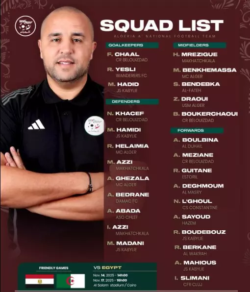 وشهدت قائمة منتخب الجزائر "الرديف" ظهور الهداف التاريخي للمنتخب الأول إسلام سليماني، بجانب عبدالرحيم دغموم لاعب المصري البورسعيدي.