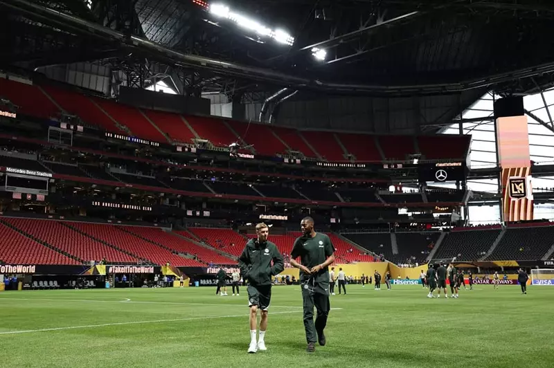 جماهير تشيلسي تتواجد في أجواء احتفالية، وحضور بقمصان البلوز، وسط سعادة في بين الأطفال في مدرجات ملعب مرسيدس بنز، التحفة المعمارية في مدينة أتالانتا الأمريكية.