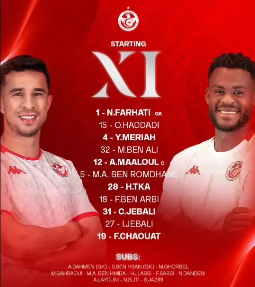 ويظهر علي معلول لاعب الصفاقسي الحالي والأهلي السابق في التشكيلة الأساسية لتونس بعد عودته لنسور قرطاج لأول مرة منذ كأس أمم أفريقيا التي أقيمت في 2024.