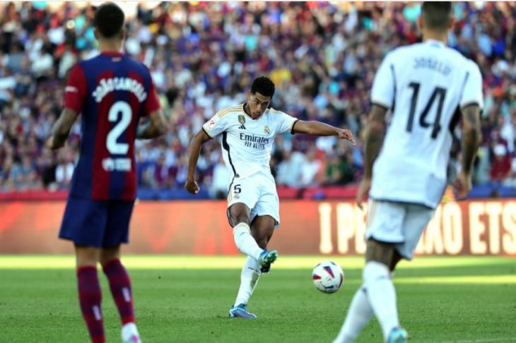 قلب الإنجليزي جود بيلينجهام نجم ريال مدريد الطاولة على برشلونة خلال لقاء الكلاسيكو الذي يجمع الفريقين، مساء اليوم السبت.