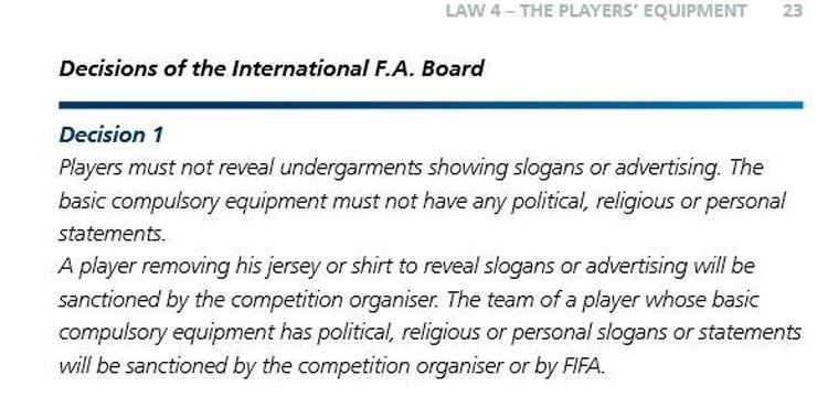 ينص قانون لعبة كرة القدم الذي يقره الفيفا على أنه : "لا يتعين على اللاعب ارتداء أي ملابس تحت قميص فريقه تظهر أي شعارات أو إعلانات، وأن الرداء الرسمي للفريق يجب أن لا يكون بها أي بيانات سياسية أو دينية أو شخصية."