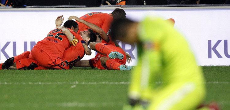 ظهر الارجنتيني ليونيل ميسي مهاجم برشلونة بعد احتفاله مع اللاعبين بهدف سيرخيو بوسكيتس القاتل أمام فالنسيا ممسكا برأسة بعد القاء زجاجه عليه من جانب جماهير فالنسيا.