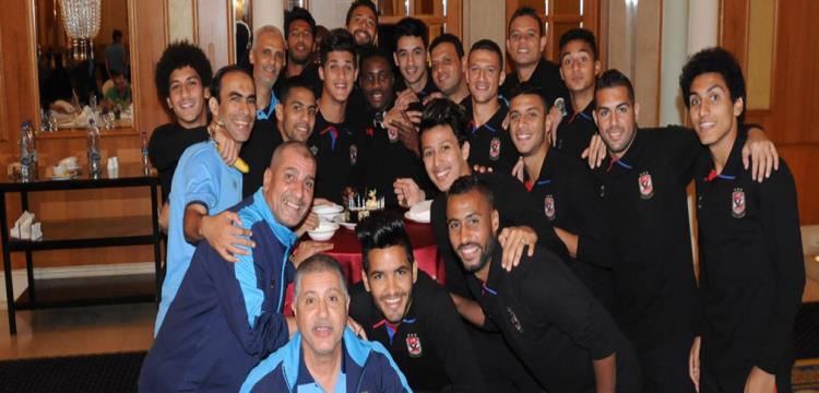 حرص لاعبو النادي الأهلي على الاحتفال بعيد ميلاد الجابوني ماليك ايفونا مهاجم الفريق خلال معسكر الفريق في الامارات.