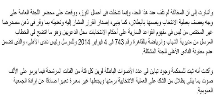 وكانت محكمة القضاء الأدارى قضت ببطلان انتخابات الأهلى وجاء ضمن حيثياتها أنه ثبت للمحكمة وجود تباين فى عدد الأصوات الباطلة قرين كل فئة من الفئات المرشحة فيما يربو على الألف صوت بما يلقى بظلال من الشك على العملية الانتخابية برمتها ويجعلها غير معبرة تعبيرا صادقا عن إرادة الجمعية العمومية.