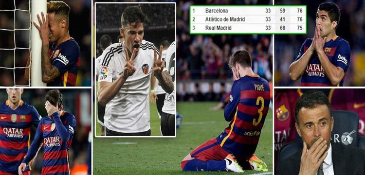 وتلقى برشلونة خسارة جديدة في الاسابيع الأخيرة على يد فالنسيا بهدفين مقابل هدف في الجولة الـ33 لمسابقة الدوري الاسباني ليهدي أتلتيكو مدريد وريال مدريد فرصة جديدة من أجل التتويج بالليجا.