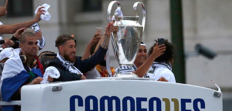 رفع قائد ريال مدريد سرخيو راموس وباقي الفريق كأس دوري أبطال أوروبا الذي توج به الملكي في ميلانو إثر تغلبه على أتلتيكو مدريد (5-3) بركلات الترجيح، وسط آلاف المشجعين الذين كانوا في انتظارهم في ميدان سيبيليس الشهير بوسط العاصمة الإسبانية للاحتفال باللقب الـ"11" للميرينجي.