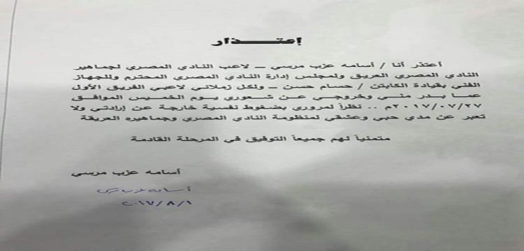 وارسل لاعب المصري لإدارة ناديه اعتذارا رسميا عن ما بدر منه وخروجه عن شعوره.