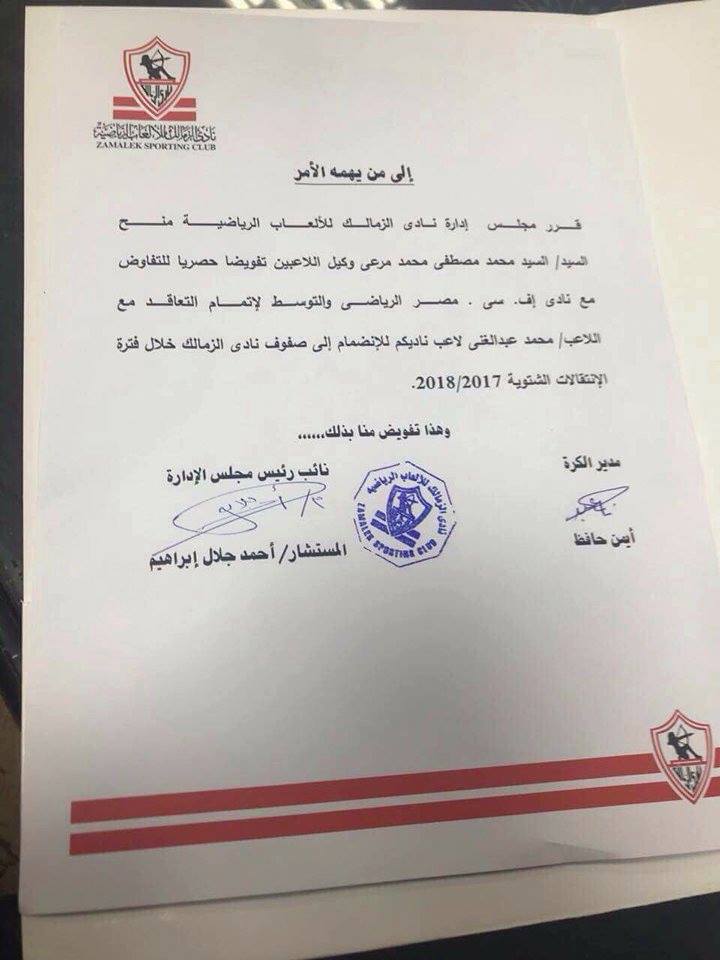 قام مجلس إدارة نادي الزمالك بتفويض محمد مصطفى محمد مرعي وكيل اللاعبين من أجل الدخول في مفاوضات مع نادي "اف سي مصر" للحصول على خدمات المدافع محمد عبدالغني.