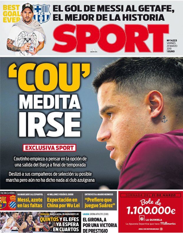 يذكر أن كوتينيو البالغ من العمر 27 عاما انتقل إلى برشلونة في يناير 2018 مقابل 160 مليون يورو حتى صيف 2023، كأغلى صفقة في تاريخ البلوجرانا.