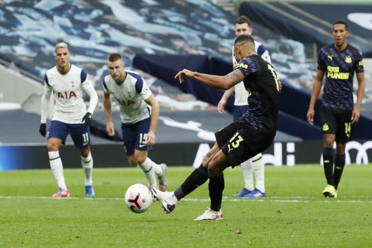 وارتطمت الكرة في يد إريك داير مدافع توتنهام داخل منطقة الجزاء في إحدى الكرات الهوائية، ليذهب حكم المباراة إلى تقنية الـVAR، ويحتسب بعدها ركلة جزاء لصالح نيوكاسل في الدقيقة الأخيرة من عمر اللقاء.