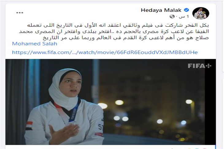 أعربت هداية ملاك بطلة التايكوندو عن شعورها بالفخر بعد المشاركة في الفيلم الوثائقي الذي أطلقه الاتحاد الدولي لكرة القدم "فيفا" عن النجم المصري محمد صلاح جناح ليفربول الإنجليزي.