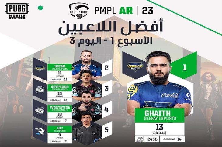 حصل اللاعب GHAITH من فريق GEEKAY ESPORTS على جائزة أفضل لاعب باليوم الثالث من الأسبوع الأول ضمن بطولة ببجي موبايل PMPL ARABIA.